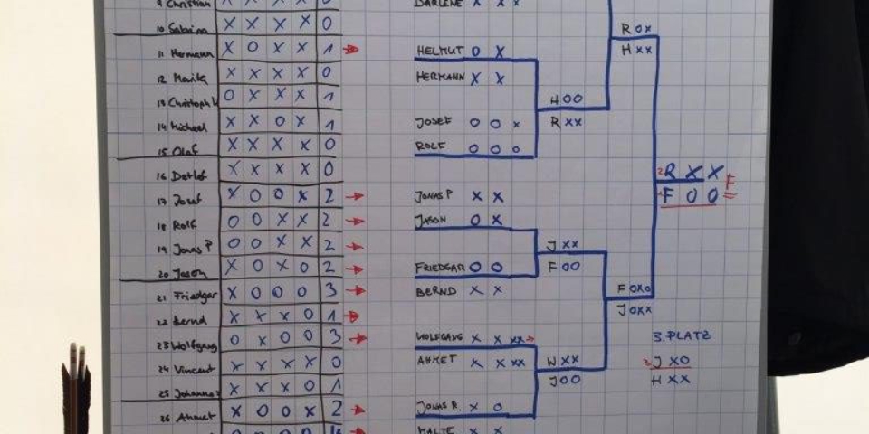 Bei der Finalrunde (KO-Tournament) schießt man paarweise gegeneinander. Nach einem spannenden Stechen hat Friedgar (Aachen) den 1. Platz, Robert (Düsseldojo) den 2. Platz und Jonas (Düsseldojo) den 3. Platz erreicht. Herzlich Glückwunsch!