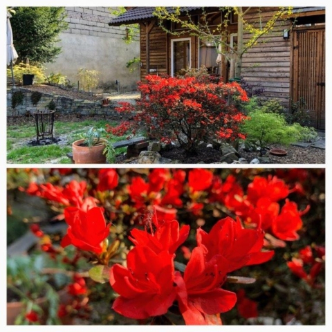 19.April 2020 schöner Kontrast mit der Azalee und dem Blauregen